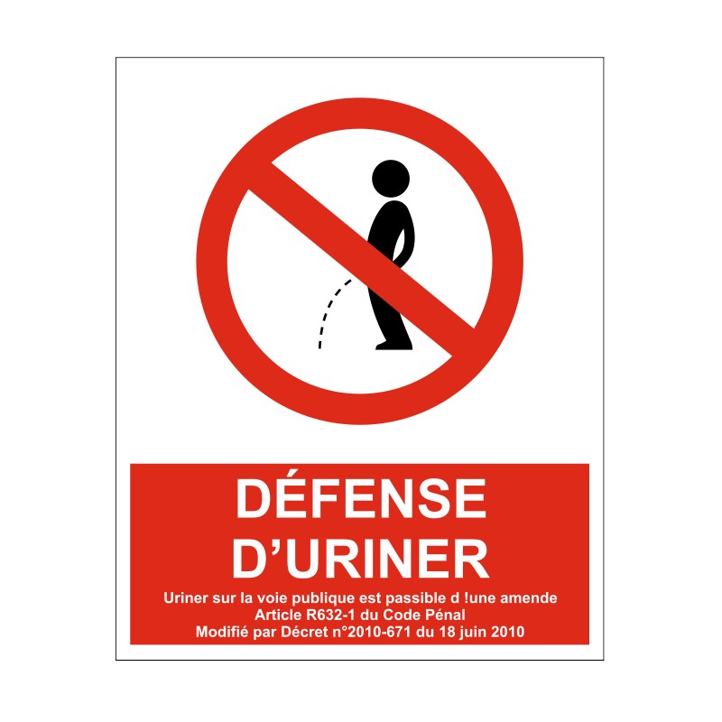 Commandez vos panneaux et autocollants défense d'uriner à coller ou à fixer dans vos locaux pour informer vos employés ou clients.